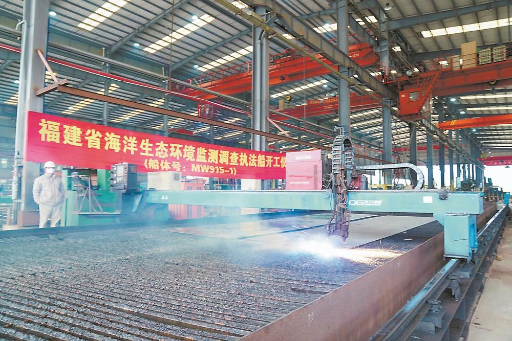 18日,福建省首艘海洋生态环境监测船在福建船政福宁建造基地开工。该监测船设计总长55.2米、型宽10米、型深4.4米,续航力2000海里,排水量约900吨,具备近岸综合海洋环境监测、探测取样和部分现场分析的能力。船舶预计2025年上半年试航交付。(记者 单志强 通讯员 何小丽 摄影报道)