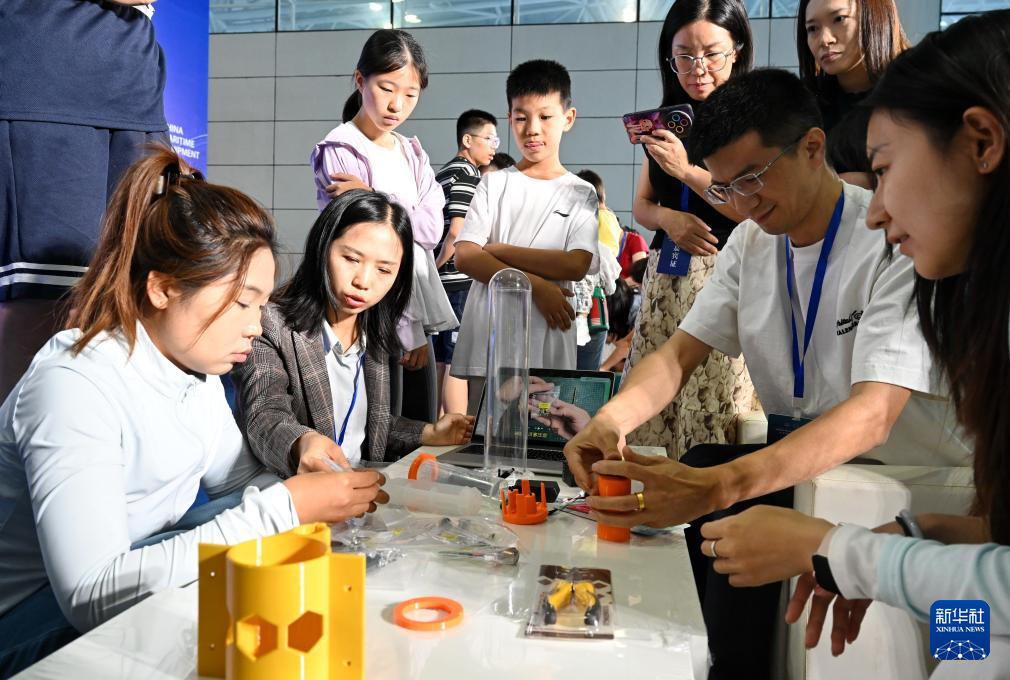 10月18日,北京市十一学校教师范爽(左二)在现场举行的教学工坊活动中教参观者制作海燕水下机器人。新华社记者 林善传 摄