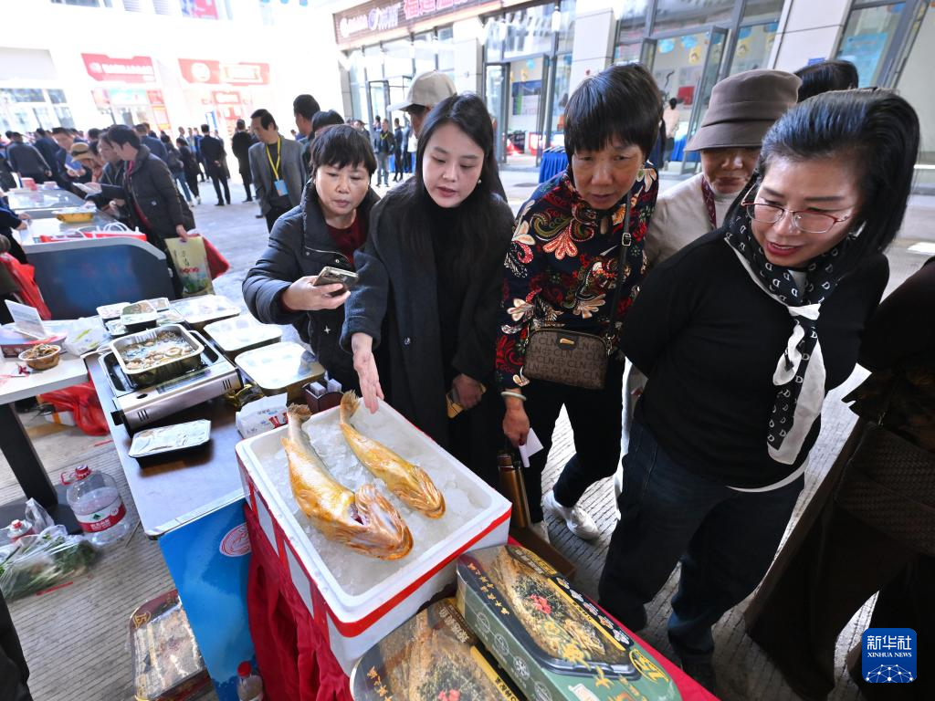 11月29日,游客在第九届宁德(霞浦)大黄鱼产业创新发展大会线下展销促销活动上选购大黄鱼产品。新华社记者 姜克红 摄