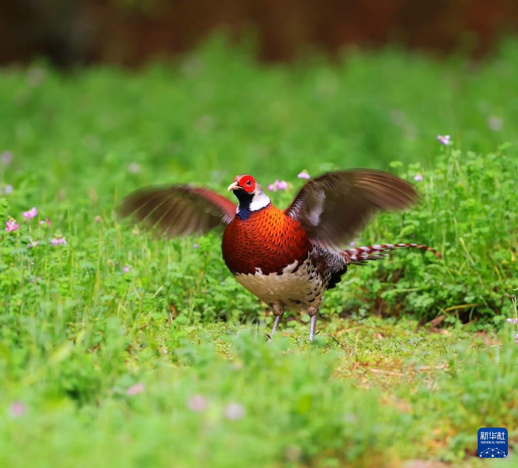在明溪县夏坊乡中溪村的一处草地上拍摄的白颈长尾雉。新华社发