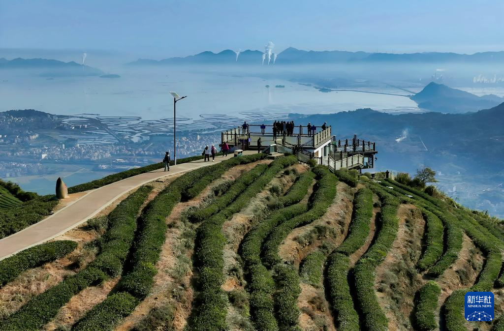 新华社照片,福州,2025年12月7日 游客在位于福州市连江县炉峰山上的观景平台观赏山海风景(12月6日摄,无人机照片)。