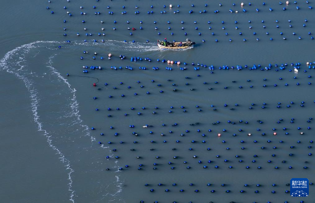 一艘渔船在福建省连江县黄岐半岛海域海上养殖区航行(12月6日摄,无人机照片)。新华社记者 魏培全 摄