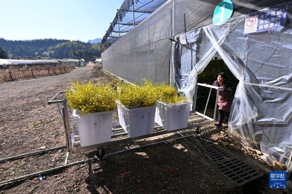 1月15日,在位于周宁县浦源镇的福建馨慧兰园艺有限公司花卉大棚内,工人运输文心兰。新华社记者 姜克红 摄