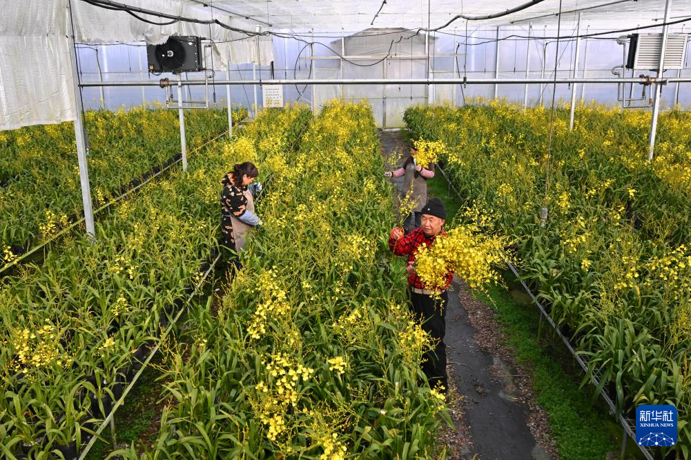 1月14日,位于福建省周宁县浦源镇的紫馨兰园花卉有限公司花卉大棚内,工人挑选大花惠兰盆栽。新华社记者 姜克红 摄