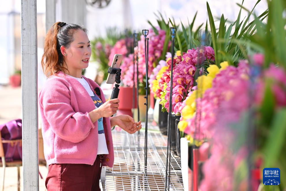 1月15日,在位于周宁县七步镇的鸿腾农业开发有限公司花卉大棚内,工作人员在电商直播大花惠兰盆栽。新华社记者 姜克红 摄