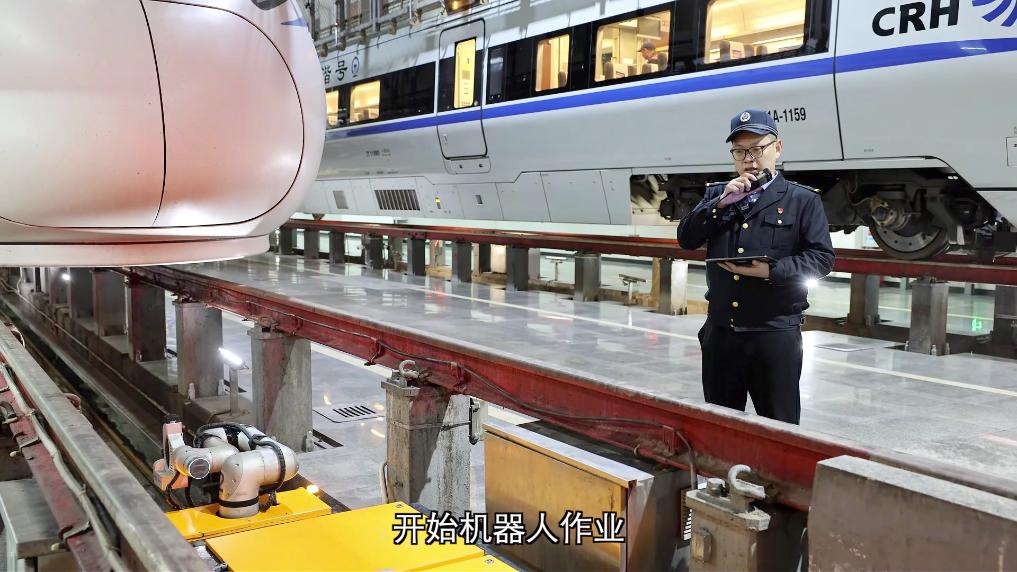 这台机器人的两端机械臂上,各搭载着一个可360度无死角旋转的高清摄像探头,沿着预设路线对动车组转向架、制动装置、悬挂系统等行车关键部件进行全方位扫描,实现毫米级的精准检测,用科技的精度守护列车运行安全。
