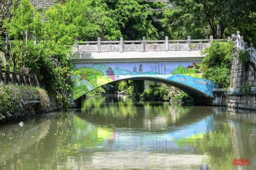 说起西湖—白马河航线,这是福州内河游的一条人气航线,航线的两端分别连着西湖公园与黎明湖公园,沿线分布着白马河公园、芳华剧院、勺园文化创意园等文化地标,生态风光怡人,文化底蕴浓厚。桥梁彩绘结合航线文化,通过诗画形式,为航线添“颜值”,增“气质”。