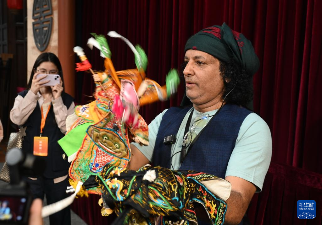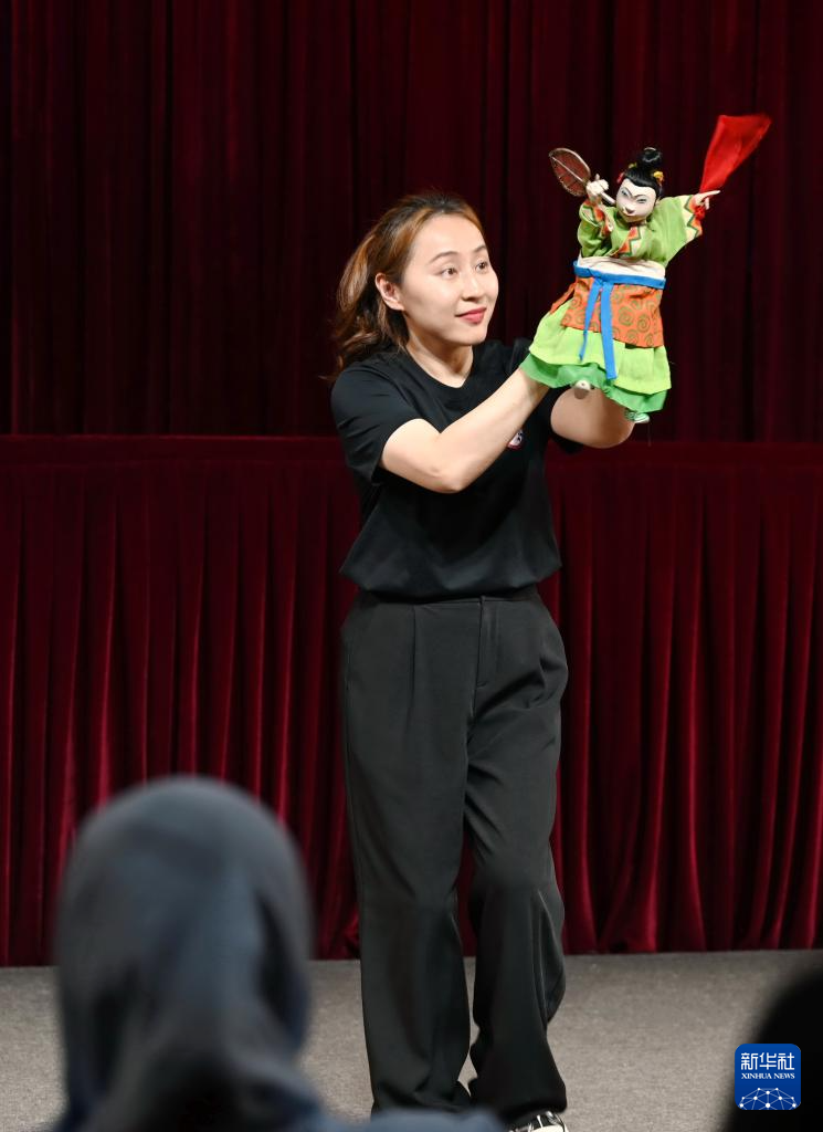 4月16日,表演者为阿拉伯艺术家展示漳州布袋木偶戏表演技艺。新华社记者 林善传 摄