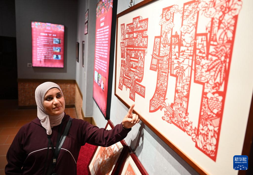 4月16日,阿拉伯艺术家在漳州市非物质文化遗产展示馆观赏剪纸艺术作品。新华社记者 林善传 摄