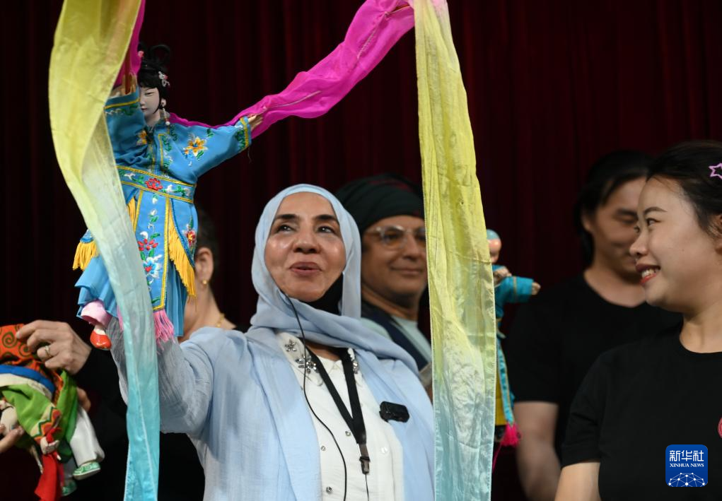 4月16日,阿拉伯艺术家在漳州木偶艺术表演馆学习布袋木偶戏表演。新华社记者 林善传 摄