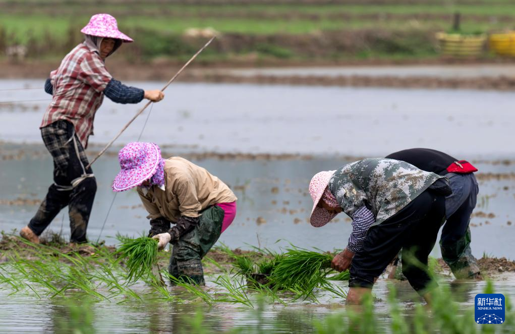 农户们在福建省福州市连江县山堂村稻田里栽插早稻秧苗(4月22日摄)。新华社记者 魏培全 摄