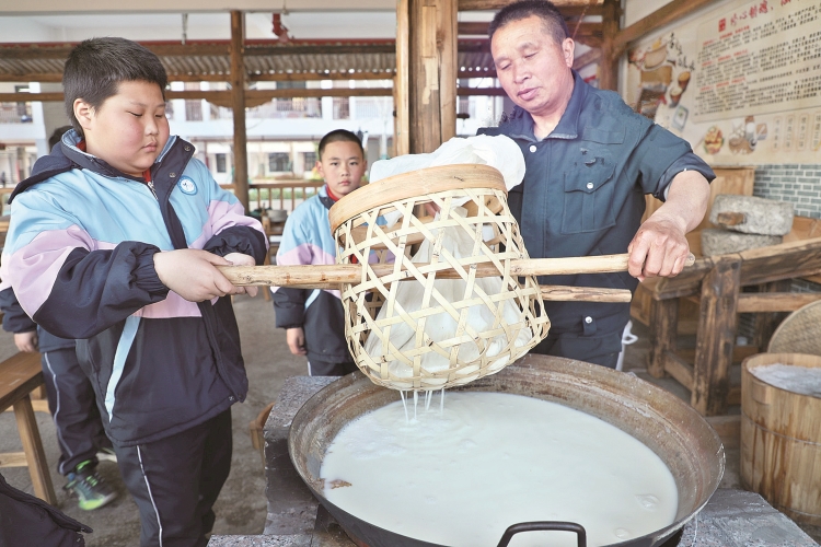 如今,全校500多名学生先后进场体验了游浆豆腐的制作技艺。“三人一组,分好工后,同学之间要动作协调。”四年级毛智轩同学认为,用石磨磨豆子虽然辛苦,但很有趣,大家每次都能开心地吃上自己制作的豆浆和豆腐。