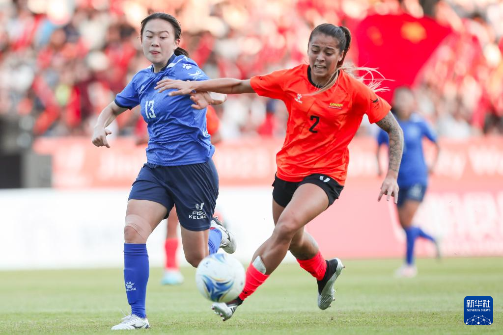 10月31日,北京师范大学队球员邹梦瑶(左)与保利斯塔大学女足球员迪奥凡娜争抢。新华社发(赖进财摄)