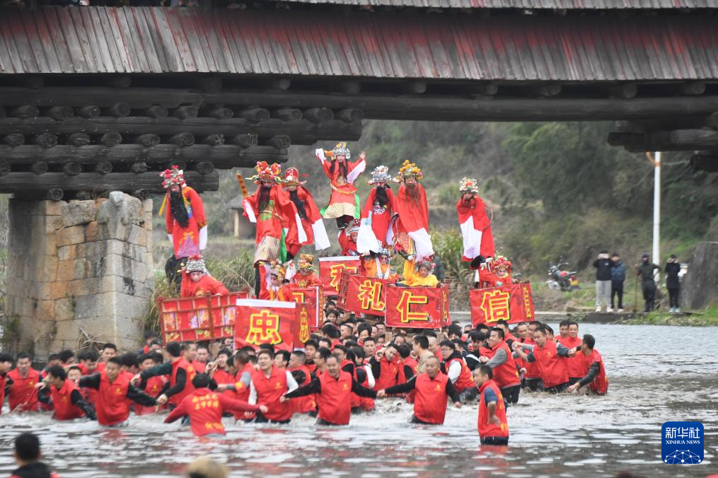 2月24日,福建省连城县罗坊乡走古事队伍穿过云龙廊桥,蹚着清岩河水前行。新华社记者 姜克红 摄