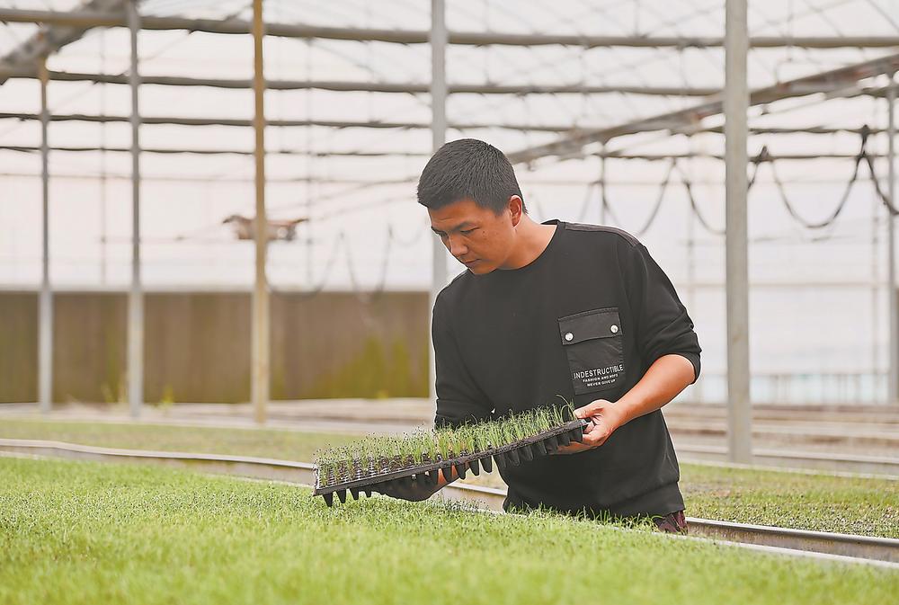 村民在大棚里查看育苗生长情况。