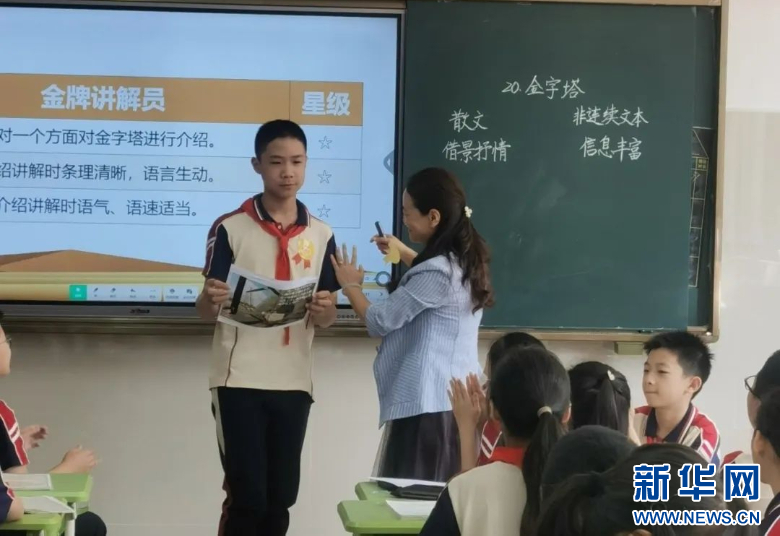 福州延安中学教育集团小学部语文老师谢成强《金字塔》一课,设计了讲解金字塔的核心任务,融合语文、数学、科学、地理等学科知识,引导孩子们举一反三为口语交际和习作做迁移。新华网发(福州市鼓楼第二中心小学教育集团供图)