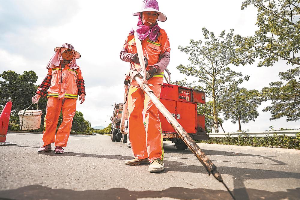 18日,在省道219线漳州芗城浦南路段,两名养护人员实施道路裂缝封闭作业。一名养护员注入沥青,另一人则在凝固后的沥青上撒上滑石粉,防止过往车辆的轮胎粘连。连日来,漳州市公路事业发展中心直属分中心结合夏季公路养护高温、高强度、紧迫性等特点,组织工作人员抢抓晴好天气,全面排查公路路面病害,并进行养护。(郑文典 杨子宏 胡丰玲)