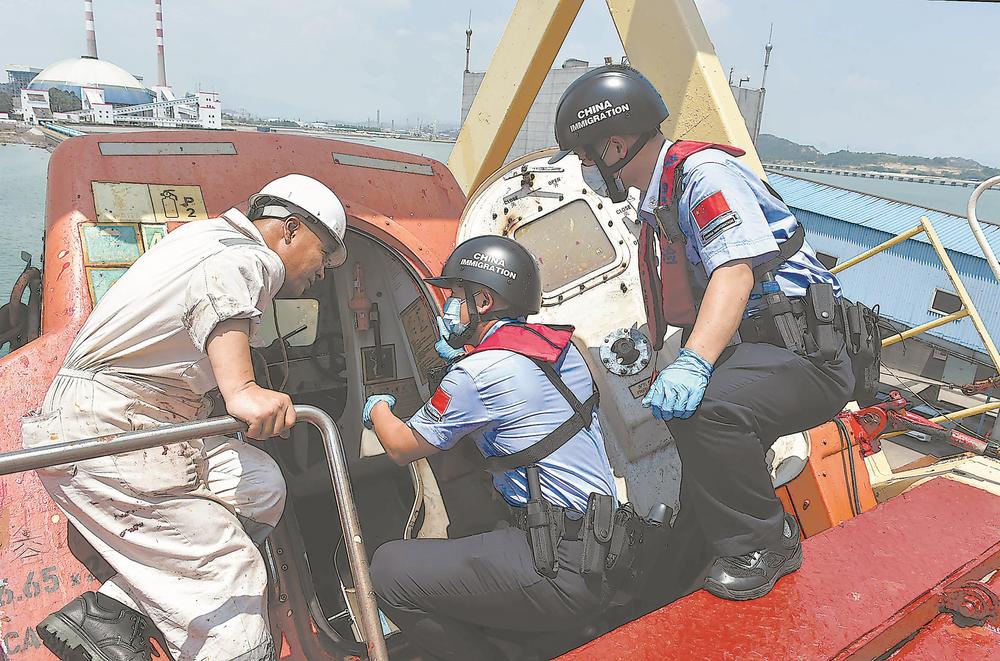 日前,载有进口煤的“鑫启航1”轮靠泊泉州市肖厝港区国能码头,肖厝边检站执勤民警登船检查,引导运煤船高效通关,保障电力企业“迎峰度夏”用煤。(黄文兴 游庆辉)