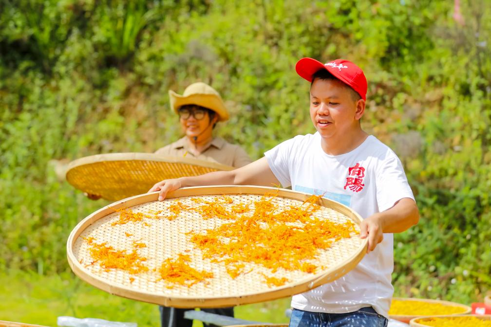 2024年8月30日,在福建省南安市向阳乡坑头村,返乡青年、“新农人”林祥桂和村民忙着晾晒采摘好的黄花菜。CICPHOTO/谢贵明 摄