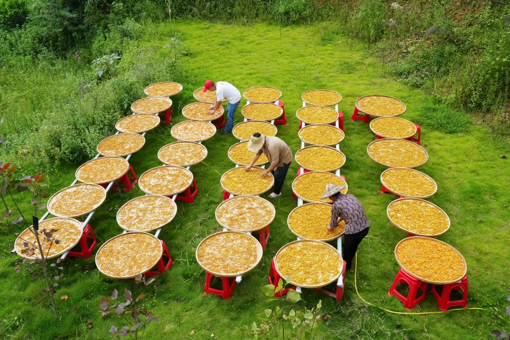 2024年8月30日,在福建省南安市向阳乡坑头村,村民忙着晾晒采摘好的黄花菜。(无人机照片)CICPHOTO/谢贵明 摄
