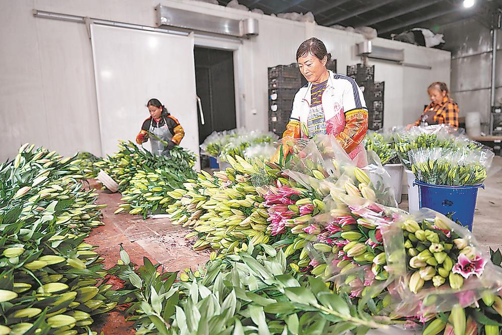 花农忙着将新鲜采摘的百合花进行捆扎和包装。