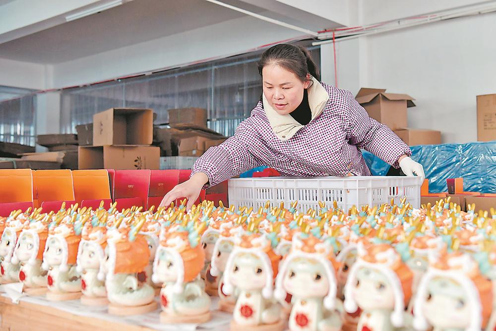 春节临近,在德化县灵客智创陶瓷文化有限公司生产车间内,工人正忙着包装生肖瓷“蛇灿莲花・夜灯摆件”。