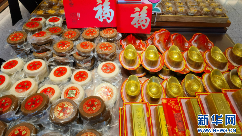 年糖、年饼、年糕等是福州传统年俗里的必备年货。在福州老字号百饼园澳门路店,年糖、年饼、年糕等不仅有传统年味,也有满满新意。福州百饼园食品有限公司品牌主理人吴凡介绍,近年来百饼园糕点注重“传统+创新”,例如用传统技艺制作的年糕,创新推出了锦鲤、金砖、元宝等造型,深受年轻人喜爱;年糖、年饼在包装上有传统的红色款和年轻化的卡通款,能满足不同人群的需求。目前,年货相关销售额已经占门店销售额的40%。