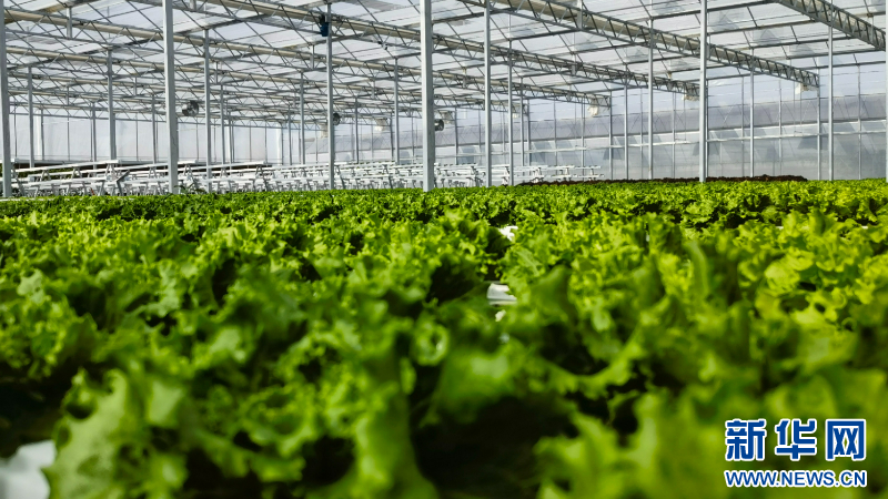 新金东农场的水培种植温室大棚里绿意满满,水培生菜经过40—50天的生长就能上市。新华网 刘丰 摄