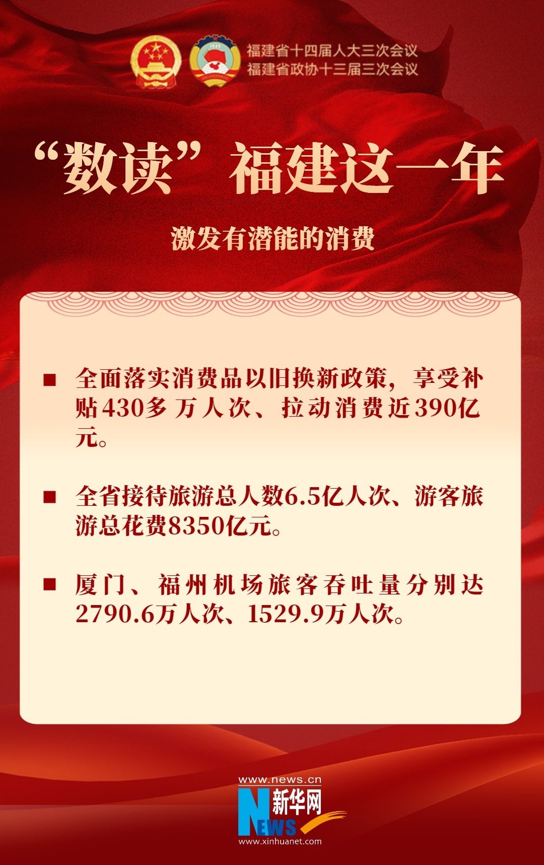 新华网福州1月13日电(刘丰 袁羽)提交福建省十四届人大三次会议审议的政府工作报告指出,2024年,福建激发有潜能的消费,全面落实消费品以旧换新政策,享受补贴430多万人次、拉动消费近390亿元;全省接待旅游总人数6.5亿人次、游客旅游总花费8350亿元。