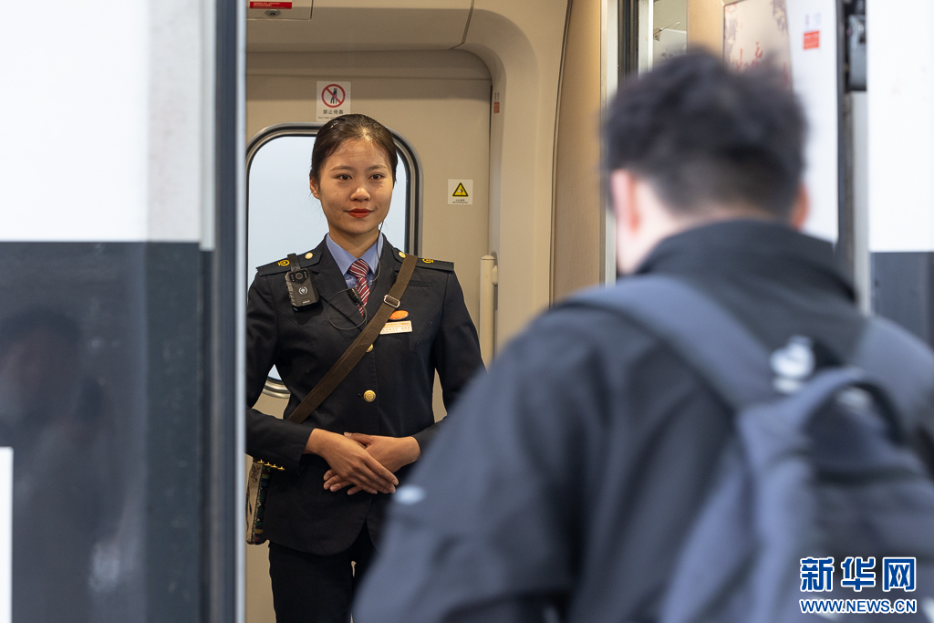 G1752次列车乘务员迎接旅客(1月26日摄)。新华网 刘东 摄