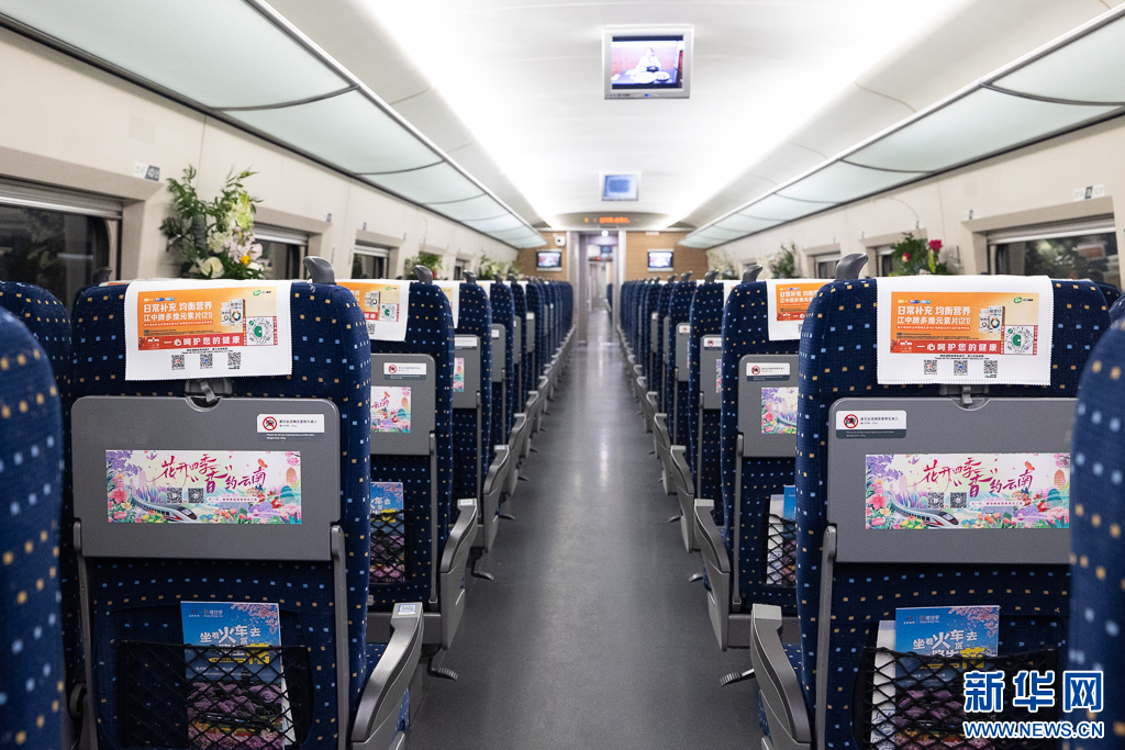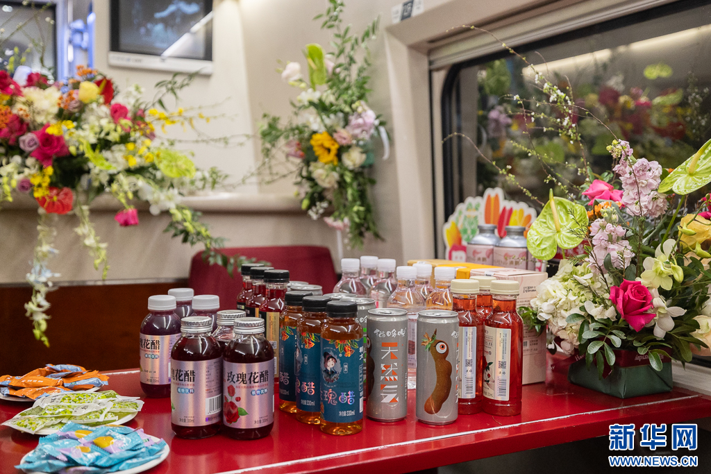 被鲜花与特色商品装点的G1752次列车车厢(1月26日摄)。新华网 刘东 摄