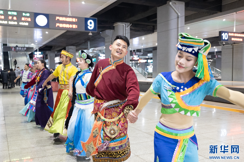 身着少数民族服饰的青年用打跳表演迎接旅客(1月26日摄)。新华网 刘东 摄