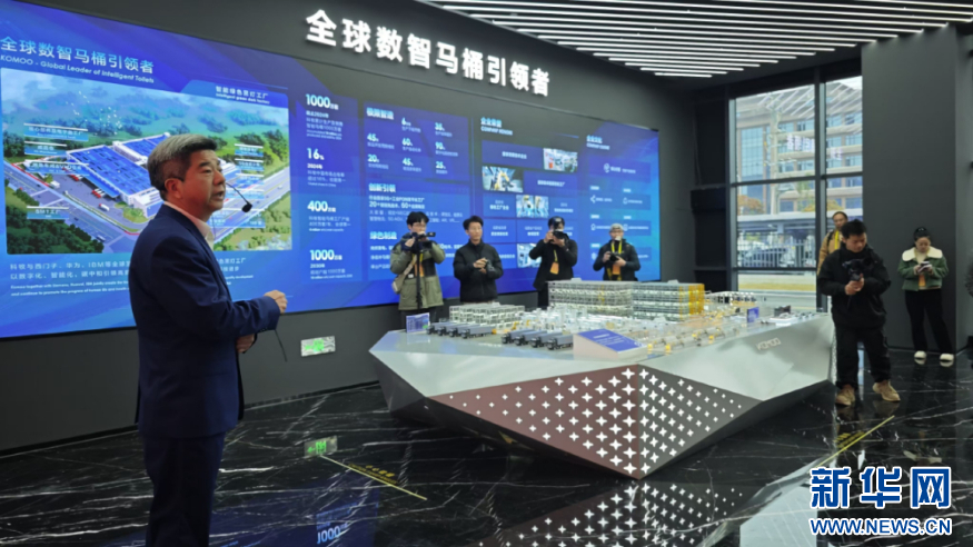 这是“绿色黑灯工厂”产线一角。这座被誉为全球单体产量最大的智能马桶工厂里,车间可实现365天无人关灯生产,年产能达400万套。新华网 刘默涵 摄