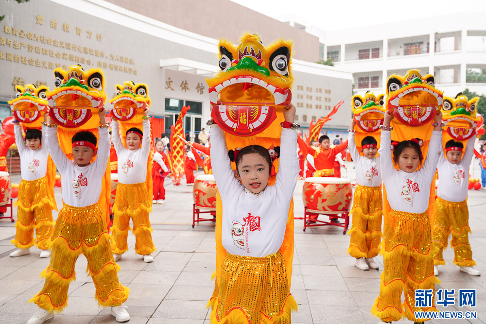 2月13日,孩子们在表演舞狮。新华网 肖和勇 摄