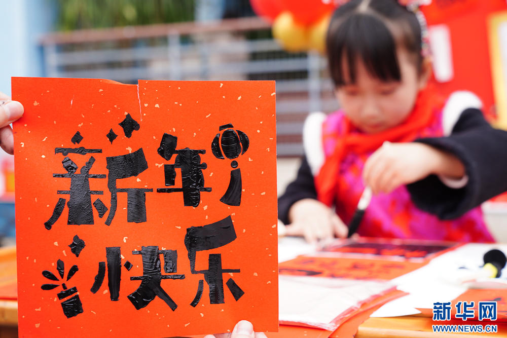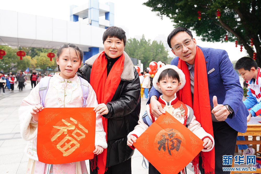 2月13日,师生们互赠福字。新华网 肖和勇 摄