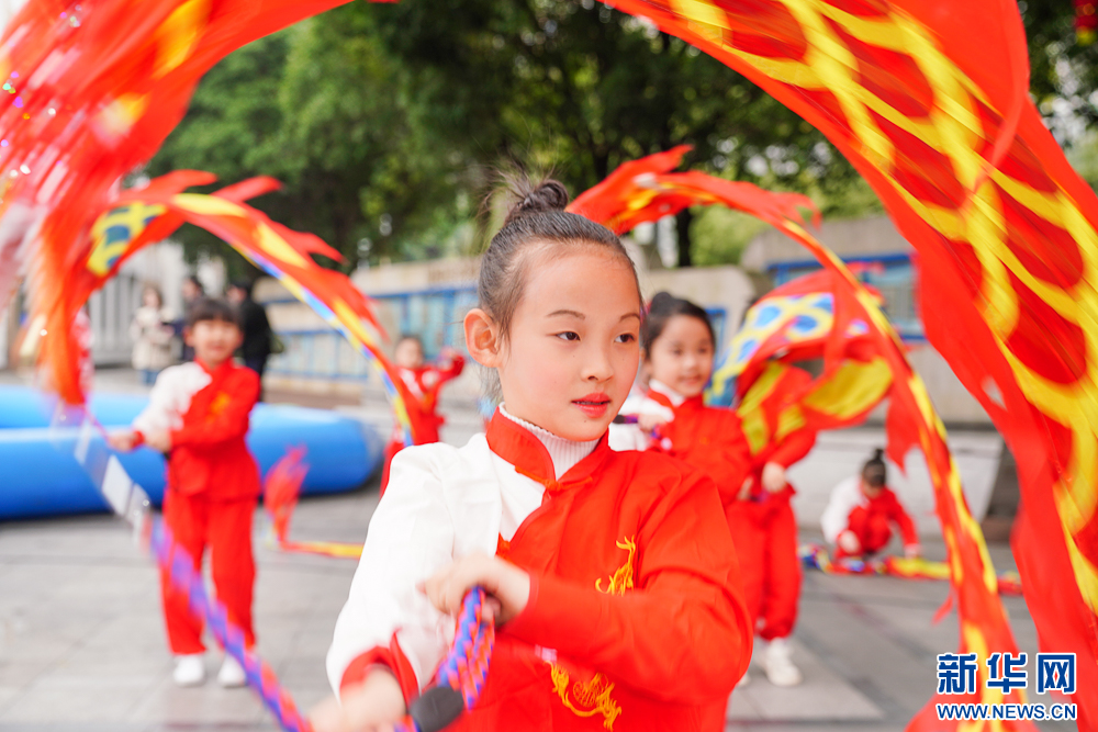 2月13日,孩子们在表演舞彩绸。新华网 肖和勇 摄