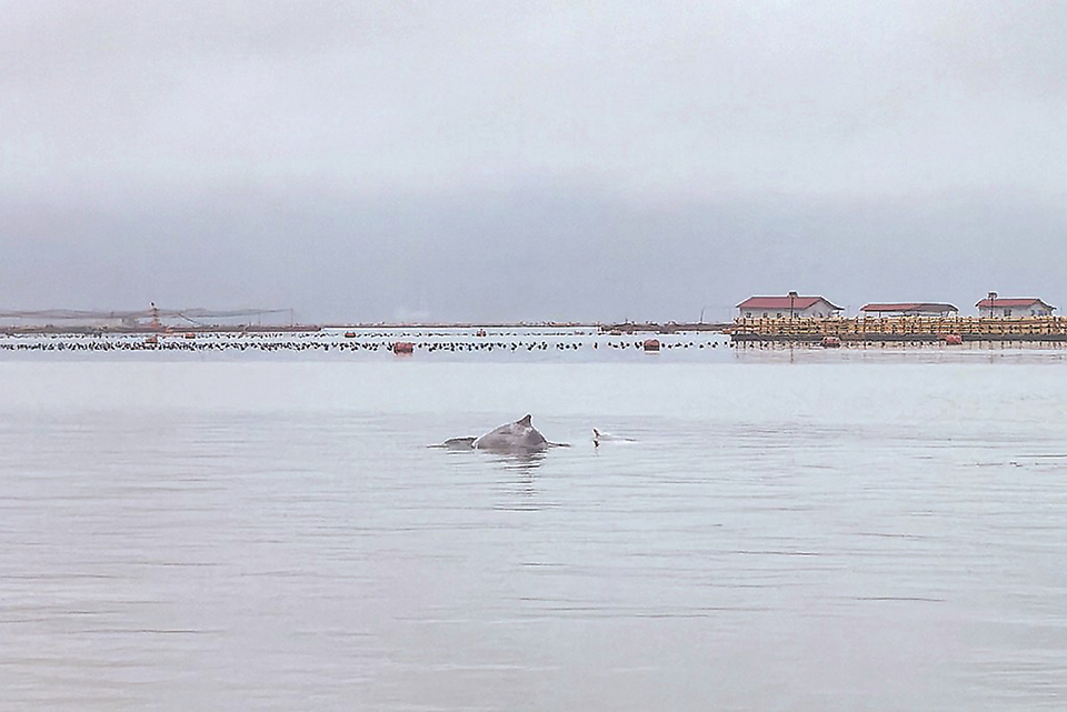 20日上午,两只中华白海豚现身福安市下白石镇宁海村近岸海域。这是去年以来该海域第五次发现中华白海豚的身影。