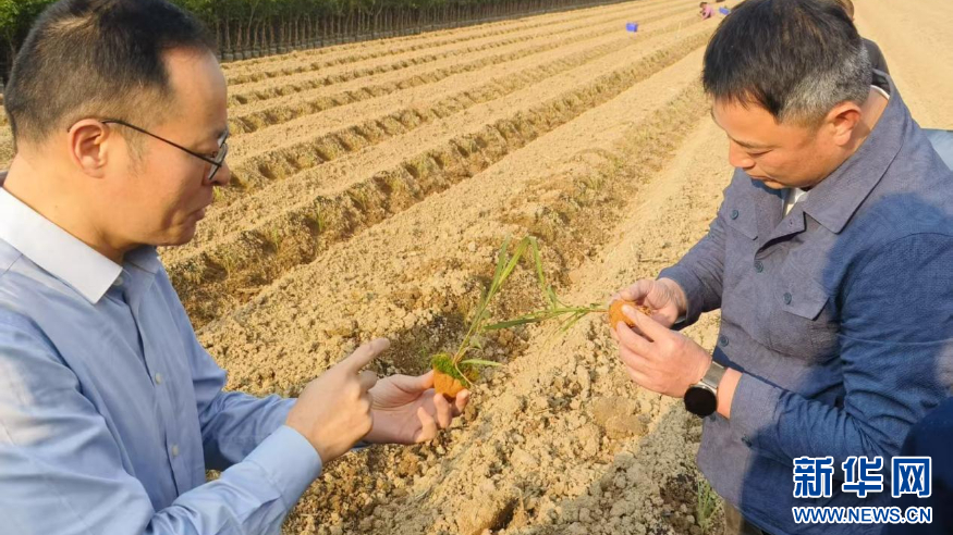 福建农林大学国家甘蔗工程技术研究中心研究员高三基(左一)在田间地头指导果蔗种植。新华网发(谢权 摄)
