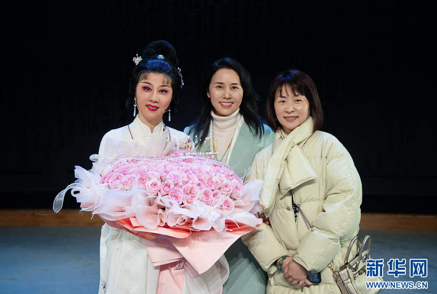 3月29日,中国文化艺术政府奖文华表演奖、中国戏剧梅花奖获得者周虹(中)和一级演员、中国戏剧梅花奖获得者陈琼(左一)与艺术爱好者合影。新华社记者 林善传 摄