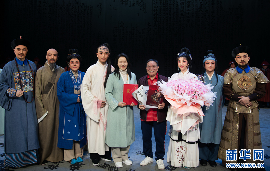 3月29日,中国文化艺术政府奖文华表演奖、中国戏剧梅花奖获得者周虹(中)和一级演员、中国戏剧梅花奖获得者陈琼(右三)及《画网巾先生》部分演员在演出现场与中国戏剧家协会会员、泉州市文艺界人士尤春成合影。新华社记者 林善传 摄
