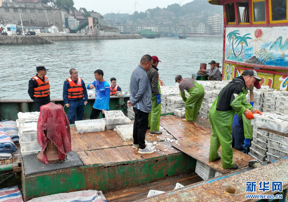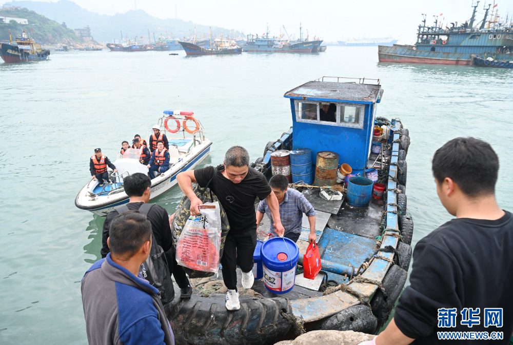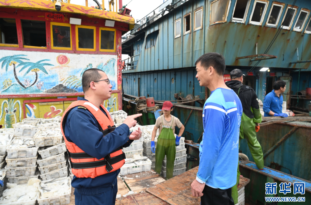 5月1日,连江县综合行政执法二大队二中队林承凯(左)等在叮嘱渔民抓紧做好海洋伏季休渔工作。新华社记者 林善传 摄