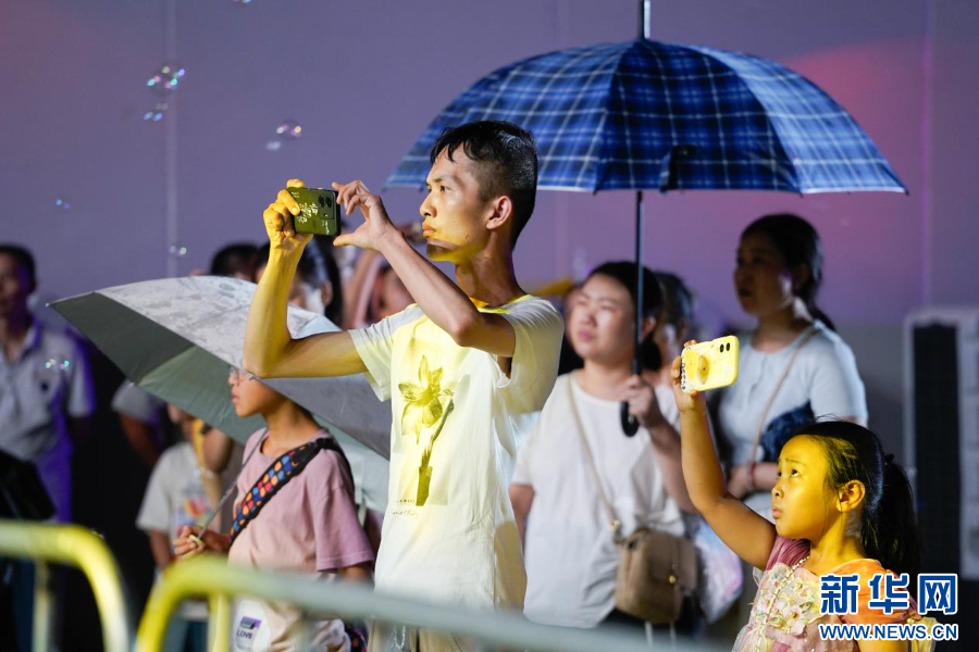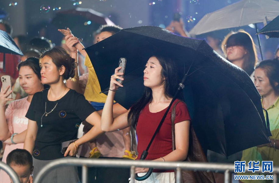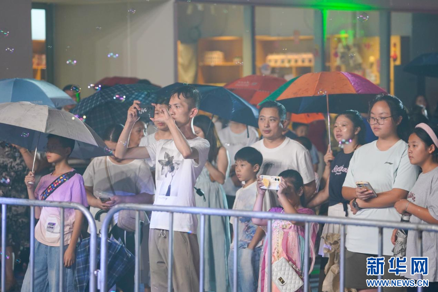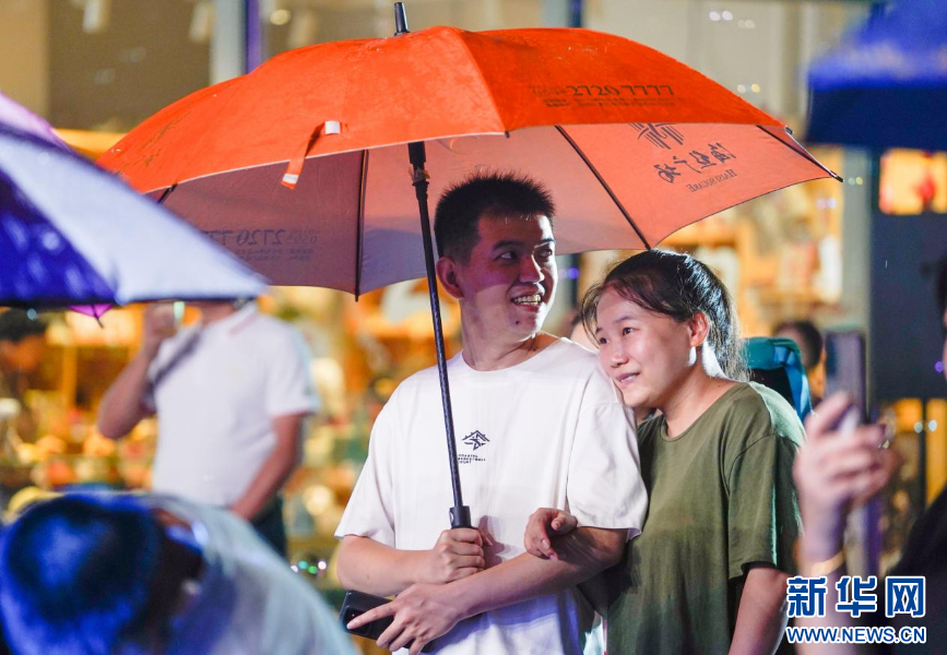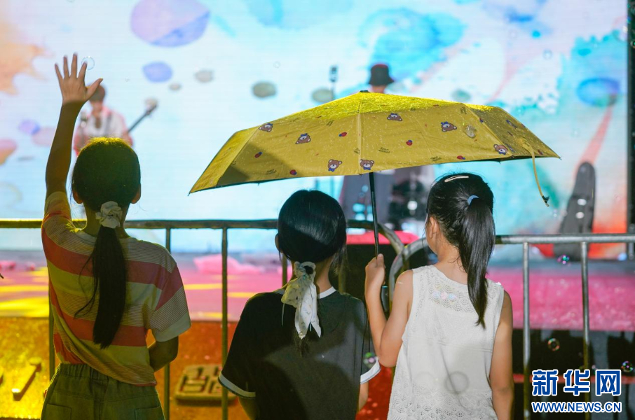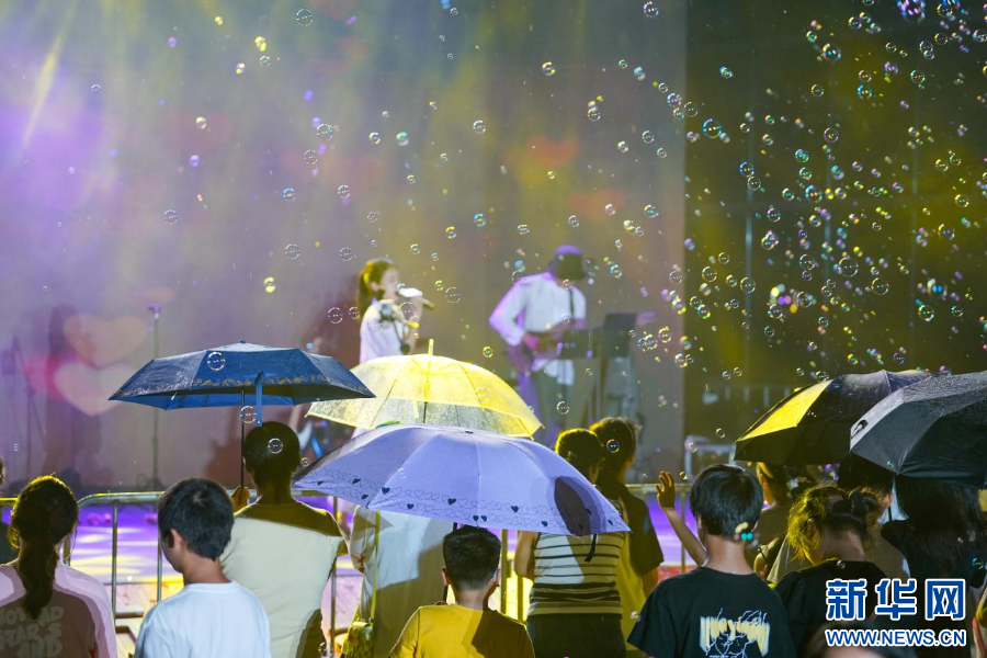 市民游客在小雨中浪漫听歌。新华网 蒋巧玲 摄