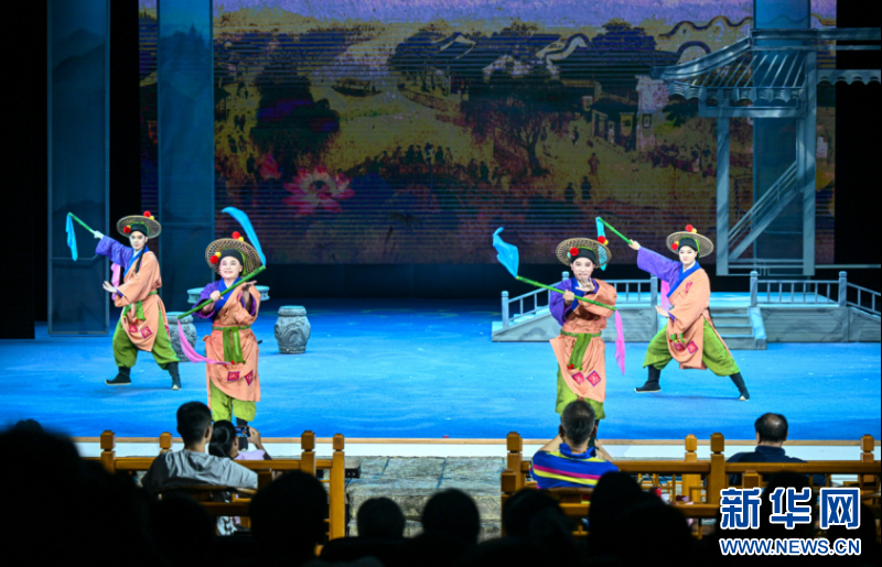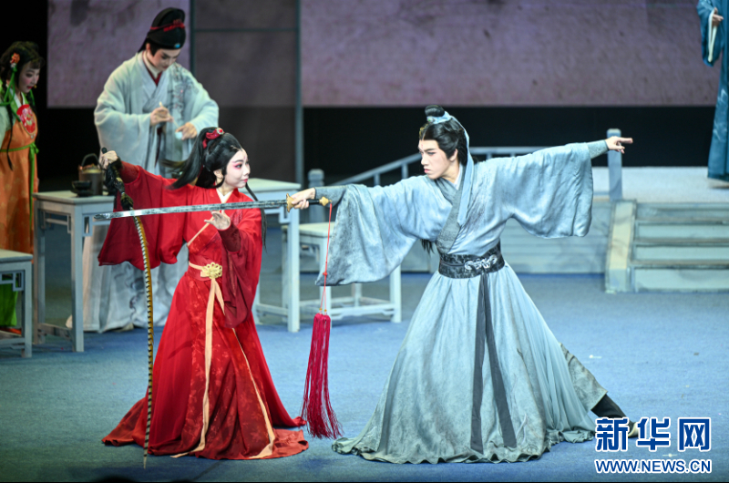 《三山旧梦》将斗茶环节外化为两位武打演员的功夫切磋,女演员舞长翎、男演员持软剑,二人你来我往、干净利落,赢得观众的阵阵喝彩。新华网发(福州闽剧艺术传承发展中心供图)
