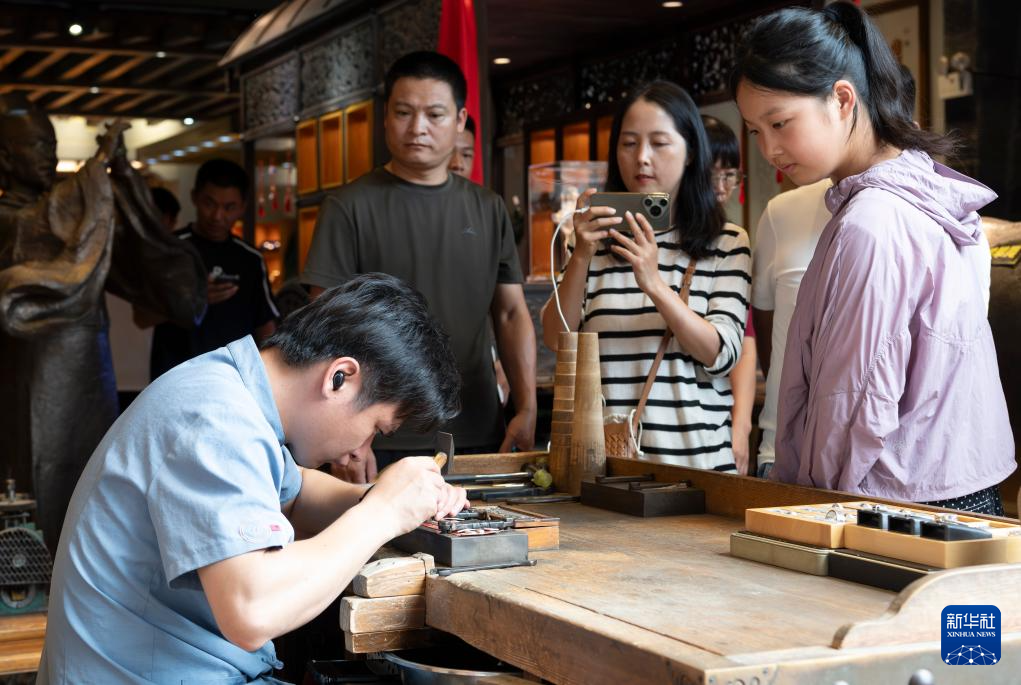 10月6日,游客在福建省福州市三坊七巷的银饰品老铺里观看非遗手工技艺。新华社记者 魏培全 摄
