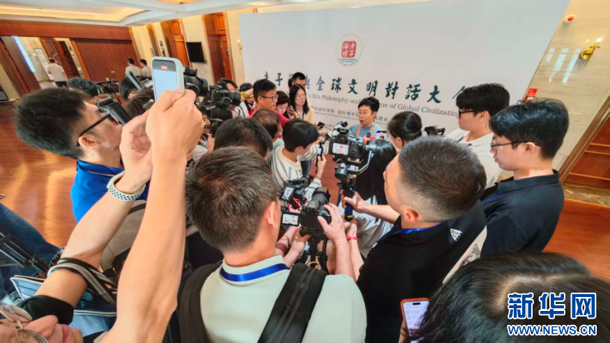 与会学者接受媒体采访。新华网 刘默涵 摄