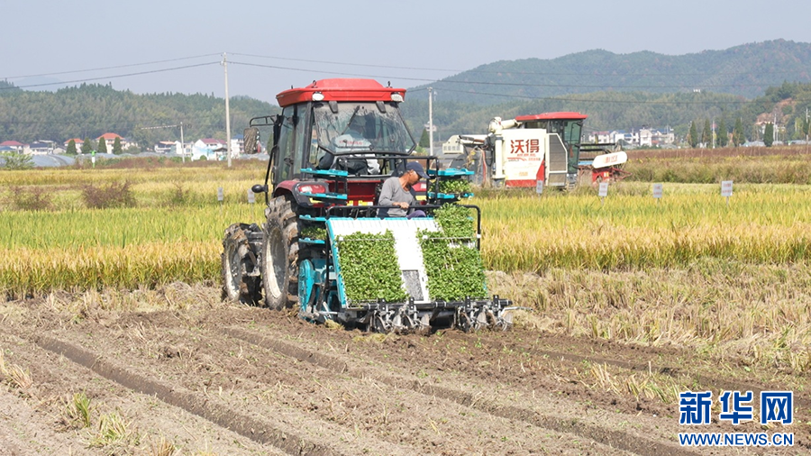 油菜移栽机和水稻收割机“同台上场”。(新华网 林晨 摄)