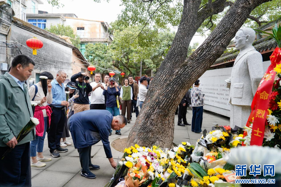 市民向吴石将军雕像献花并鞠躬致敬。新华网 蒋巧玲 摄