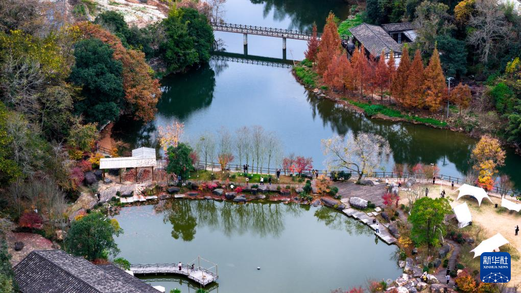冬日时节,福建省福州市晋安区寿山乡九峰村层林尽染,火红的枫叶和水杉与古朴村落、清澈溪流、石拱桥影相映成趣,共同勾勒出一幅冬日胜景,吸引众多游人前来。