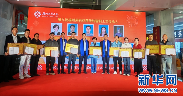 11位优秀茶人被授予“福州茉莉花茶窨制工艺传承人”荣誉称号。新华网 程立葳 摄