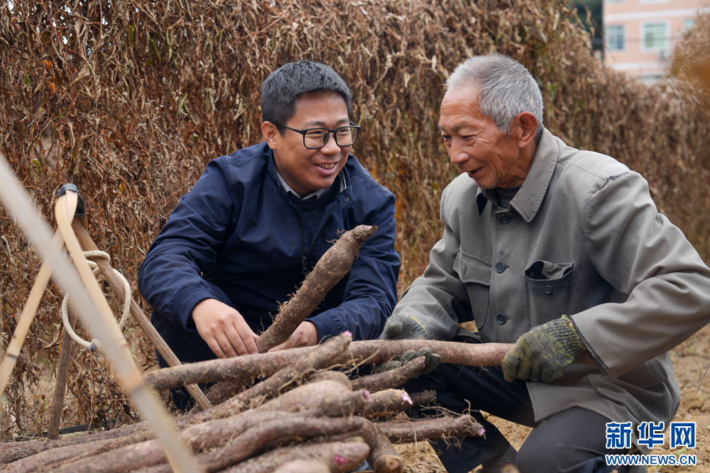 1月5日,中国人民银行福建省分行派驻德化县龙浔镇英山村党支部第一书记林煌丁(左)在田间与农户交流,了解淮山种植收成及“淮山贷”资金需求情况。